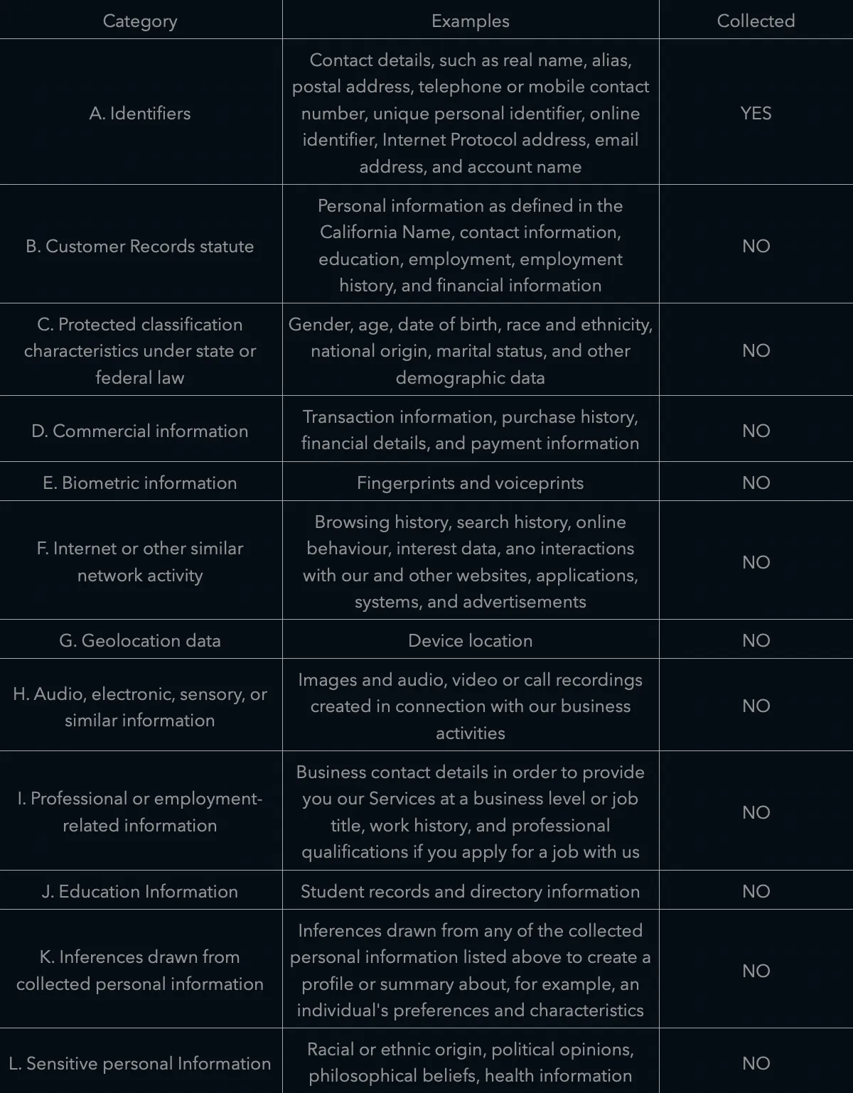 The table below shows the categories of personal information we have collected in the past twelve (12) months. The table includes illustrative examples of each category and does not reflect the personal information we collect from you. For a comprehensive inventory of all personal information we process, please refer to the section 'WHAT INFORMATION DO WE COLLECT?'